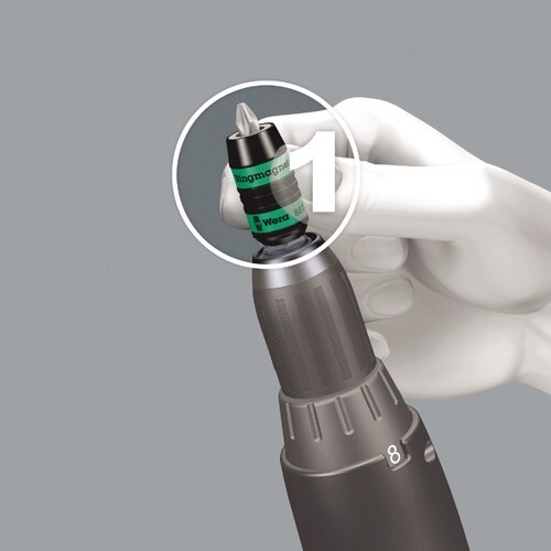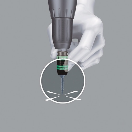 887/4 RRシリーズ。DIN ISO 1173−C 6.3およびE 6.3(ISO 1173)に準拠した六角形ドライブを備えたビットに適した、ラピダプター汎用ホルダー。フローティング型の自由回転磁性スリーブは、大きく重いネジでもしっかりと固定します。ラピダプターは、スリーブを作動させずにビットを取り付けられます。ビットはスリーブを前方へ押し出すだけで、簡単に取り外せるため、片手でビットを素早く交換できます。6.35mm六角、DIN ISO 1173−F 6.3に準拠したパワードライバーホルダーに適しています。
