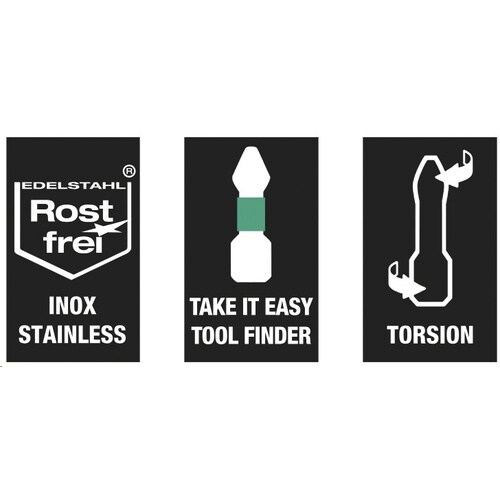 3867/1 TSシリーズ。ステンレス鋼で造られており、もらい錆を限りなく防ぎます。力を加えたときの衝撃をトーションゾーンが吸収することにより、ビット自体の早期摩耗を防ぎ、耐久年数が延びます。1/4”六角差し込み、DIN ISO 1173−D 6.3基準のホルダーに対応しています。Take it easy色分けシステム形状によって色分けされています。