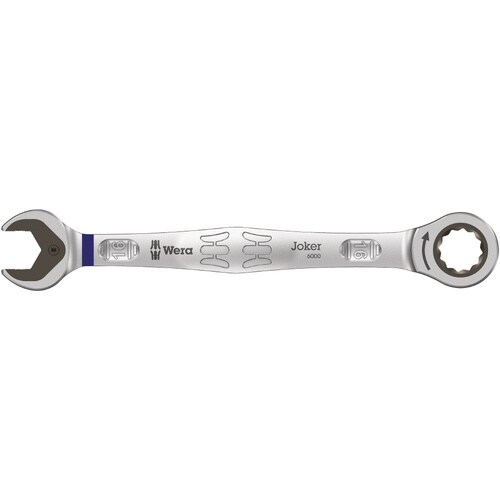 6000 Jokerシリーズ。開口部に取り付けた取替可能な金属プレートは実用的な保持機能を持ち、非常に硬い歯で、ネジとソケットをつかみ、滑るリスクを減らす。一体型保持機能により、ネジ頭の滑り落ちを防ぎ、高トルクをかけることができる。ダブルヘックスの形状により、ネジまたはボルトとの確実なくっつけが保証され、スリップのリスクが軽減される。開口側のわずか30°の戻り角により、ねじ回し中の時間のかかるレンチの回転を回避できる。メガネ側のラチェット機能は、限られたスペースでも80歯の高いギアを備えている。特別に幾何学に基づく形状により、効率よいトルク伝達と反曲がることが可能になる。高性能クロムモリブデン鋼製で、耐食性に優れたニッケルクロムコーティングが施されている。サイズによる色分けのTake it easy 色分けシステム付き。
