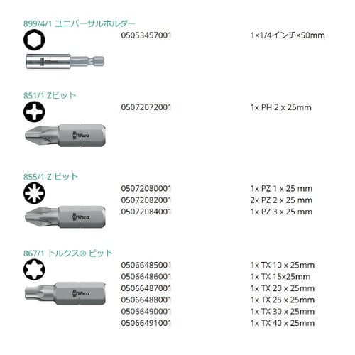 ユニバーサルホルダー1/4”×50mm(053457)、プラスビットPH2(072072)、ポジビットPZ1・2・3(072080・072082・072084)、トルクスビットTX10・15・20・25・30・40(066485・066486・066487・066488・066490・066491)