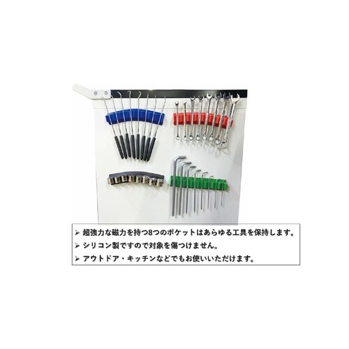 フレキシブルタイプのマグネットツールホルダーです。超強力な磁力を持つ8つのポケットはあらゆる工具を保持します。 平面だけでなく曲がったところにもぴったりフィットします。シリコン製ですので対象を傷つけず、あらゆるシーンでお使いいただけます。アウトドア・キッチンなどでもお使いいただけます。