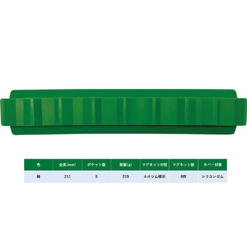 マグネット数:8枚 | カバー材質:シリコンゴム | マグネット材質:ネオジム磁石 | 色:緑 | 全長(mm):211 | ポケット数:8 | 質量…