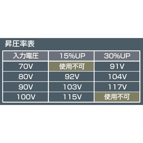 | 注意事項 | ※■ご使用する機器の許容電圧を確認し本機の仕様範囲内でご使用ください。■感電防止の為、電圧切替時には電源ブレーカーを切るか、差込プラグを電源から抜いて切替してください。■入力電圧70Vの場合、切替スイッチを15%UPに切り替えても低電圧になるため使用不可になります。■入力電圧100Vの場合では30%UPの昇圧を使用しないでください。過電圧により内部部品(IC等電子部品)および電圧工具(モータ等)を損傷する恐れがあるので十分注意してください。 |