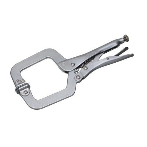 ■ロック開放レバーは、ロック時に指を挟み込まない方向へ動きます。■ワークにあわせて先端のパットが動くため、傾斜物等の固定にも便利です。 |
