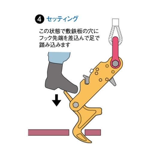 ■敷鉄板の敷設・撤去作業に最適。■フックの取外しは、ロックを解除した状態で吊上げれば容易に抜去できます。■敷鉄板専用フック(抜去式)。 |