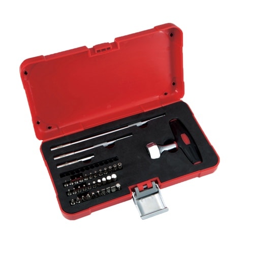 ■ラチェット機能付T形グリップに3サイズの差替式ビットホルダーと使用頻度の高い32個のビットを付属したフルセット。■マグネット付(ビットホルダー)。■送り角8°のラチェット機構。■ねじ、ビスの保持に便 |