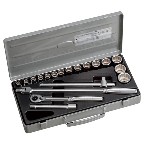 ソケット形状:12角 | 差込角(mm):12.7 | セット品(点):19 | 質量(kg):4.8 | 化粧箱寸法(mm):w406×d213×h…