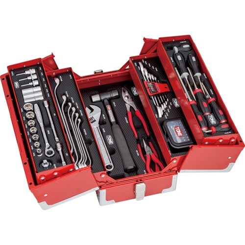 ■自動車整備用として様々な場面で活躍する充実のセット。■天面フラットV形3段式メタルケース。■全段プラスチックトレー付。■グッドデザイン賞 受賞製品採用。■カーボン調トレー採用。