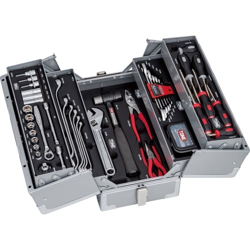 ■自動車整備用として様々な場面で活躍する充実のセット。■天面フラットV形3段式メタルケース。■全段プラスチックトレー付。■グッドデザイン賞 受賞製品採用。■カーボン調トレー採用。 |