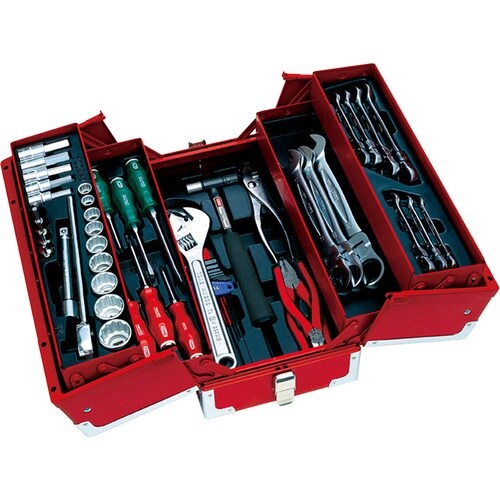 ■首振ラチェットめがねレンチを採用した12.7sq.セット。■天面フラットV形3段式メタルケース。■全段プラスチックトレー付。■グッドデザイン賞 受賞製品採用。