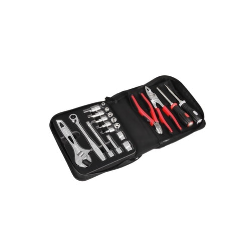 ■防汚・防水性に優れた耐久性の高いツールバッグを採用した、軽量・コンパクトで持ち運びに便利なツールセット。■各種メンテナンスに最適な工具を厳選したスタンダードモデル。■カーボン調トレー付。 |
