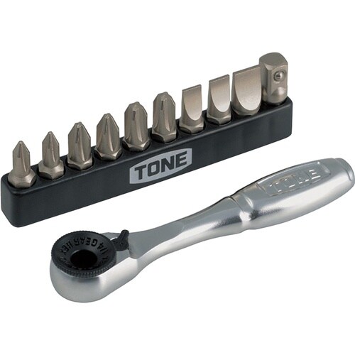 ■細かな送り角度と早回し機能により、狭い場所での作業に便利な差替式のビットラチェットセット。使用頻度の高いビットを厳選した充実の内容。■ビニールパック入。 |