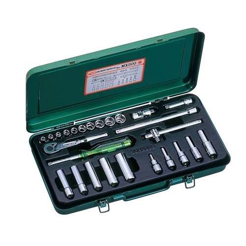 ■スタンダードソケット、ディープソケット、ヘキサゴンソケットの混合セットメタルケースと頑丈な梨地トレー、「次世代工具シリーズ」のハンドルを採用。 |