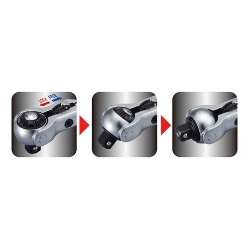 ■72枚歯に対して2つのセグメントカムにより歯数144枚相当を実現(送り角2.5°)。■ヘッド部はロック機構により自在に角度の調節ができます。■グリップ部はアルミ製で軽く、ショートタイプで作業性が良好 |