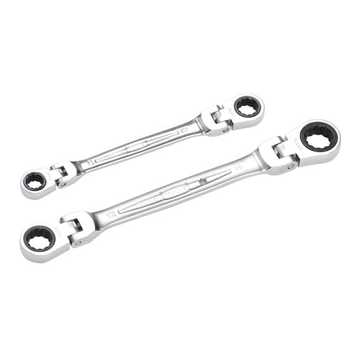 ■両側にラチェット機構のついためがね部を設け、1本で2サイズに対応。両ヘッドともに15度ずつの角度調整が可能なため、奥まった箇所での作業が可能。安全ロープ取付け穴付(RMFW−1214以上のサイズ)。 |