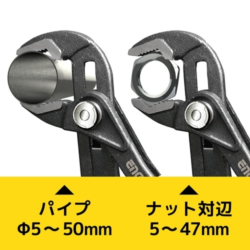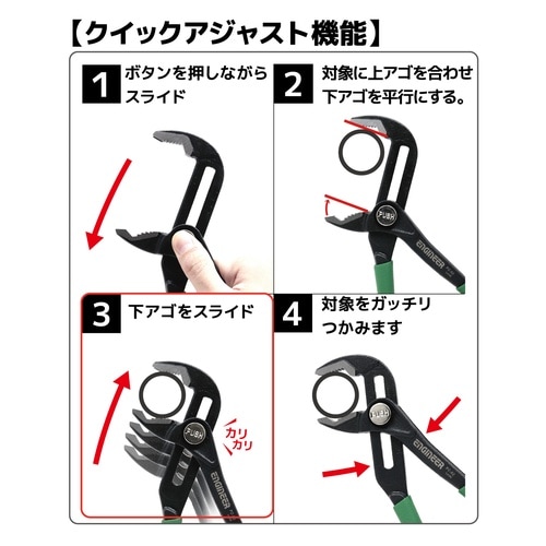 ■ネジ外し機能を搭載した、クイックアジャスト機能付きウォーターポンププライヤー。■スムーズなクイックアジャスト機能搭載で、グリップをスライドさせるだけで開き幅を調整できます。■潰れたネジ、錆びたネジを |