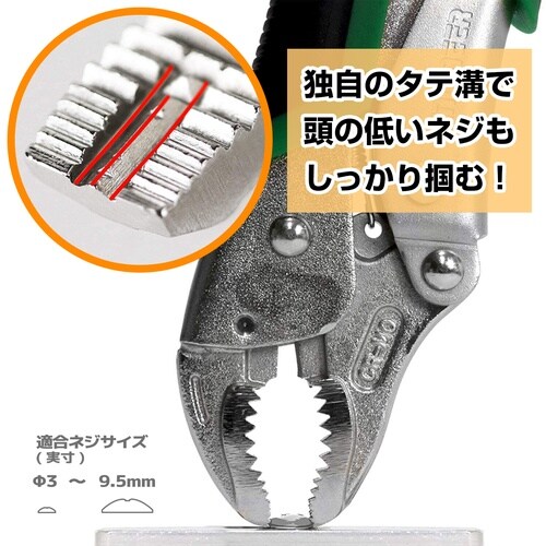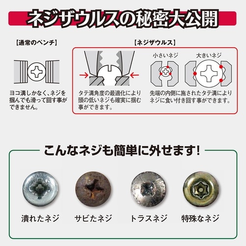 ■つかんだら離さない!潰れたネジをロックして回す。■狭く奥まった所のネジも外せるミドルノーズ。 |