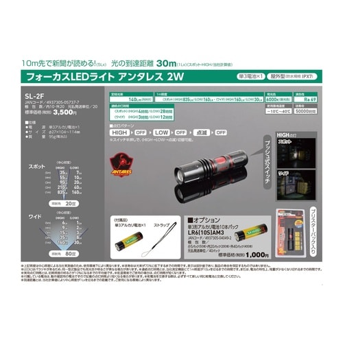 | 注意事項 | ※■照度は中心照度による日動工業社実測値のため、使用環境下により異なります。■球寿命は光束が70%に低下するまでの時間です。表示は設計値であり、製品の寿命を保証するものではありません。■LEDにはバラツキがあるため、同一型式製品でも発光色や明るさが異なる場合があります。■連続点灯時間とは、日動工業社測定機器にて1m照度が10Lxを切るまでの時間です。または、電池の特性上、残量が少なくなり切れるまでの時間です。 |