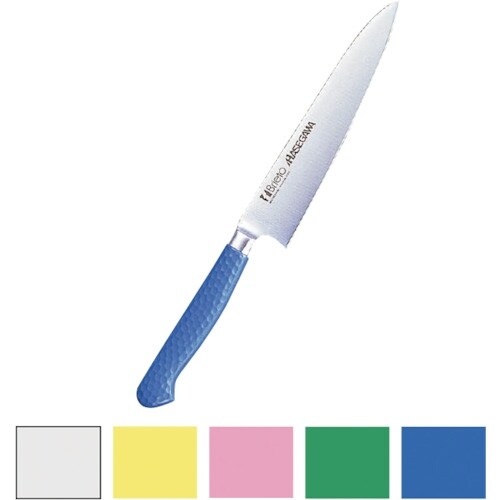 刃部とグリップがステンレス一体構造で衛生的です。グリップは抗菌特殊塗装で、食材別使い分け管理が容易。材質は不錆スウェーデン鋼をベースにしたブライト特殊鋼で、切れ味抜群。 |