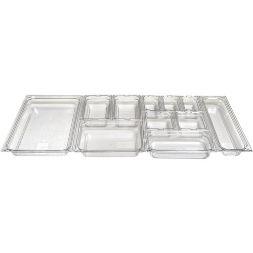 カーライル・ポリカーボネイト製フードパンは透明度が高いので、内容物の状態や識別確認が容易です。底面は梨地加工を施しており、擦れなどからのキズが目立たず、また両サイドには目盛りがついています。 |