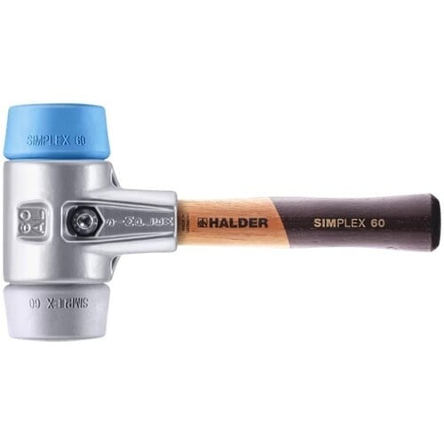 SIMPLEXプラスチックハンマーは、TPEソフト(青、ソフト、傷なし)とTPEミッド(グレー、中硬質、傷なし)のインサートを組み合わせたモデルです。 |