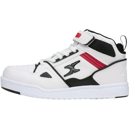 レースアップ仕様に加えて、足首部分に締めつけ具合を調整できるマジックテープを装着して、足首やくるぶしをしっかりガードするミッドカットモデルです。履口のカッティングを工夫し、着脱を容易にしています。 |