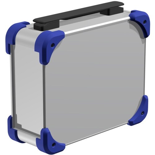 キャリングハンドル付の耐衝撃型アルミケースです。コーナーガードは弾力性のあるTPE (エラストマ) 製で、 滑りにくくゴム足の役割にもなります。