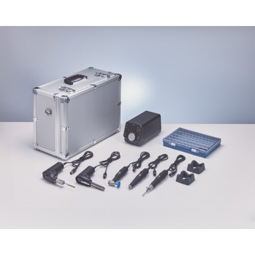 バリ取りから研磨仕上げまで、代表的なD.C.モーターハンドピースのフルセットです。切る・削る・磨く・穴あけ、あらゆる加工をバックアップする精密電動工具セットです。 |