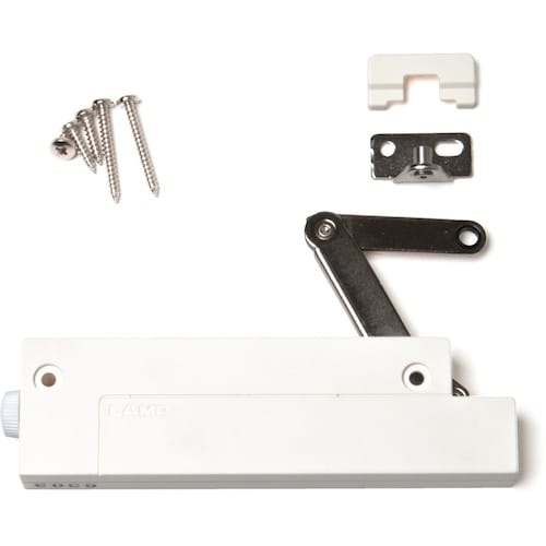 ラプコン機構により、下開き扉がゆっくりと静かに開くステーです。木口面にユニットを合わせてねじ止めするだけで簡単に施工できます。