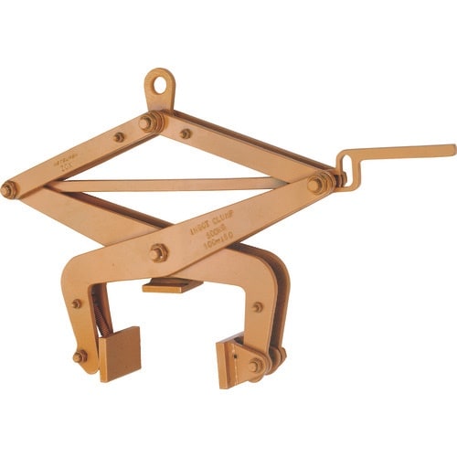 コンクリートや石材の角柱物材を1ー2台で吊上げるクランプです。取付け、取外し時に操作が楽にできるよう開放ロック機構を備えています。 |