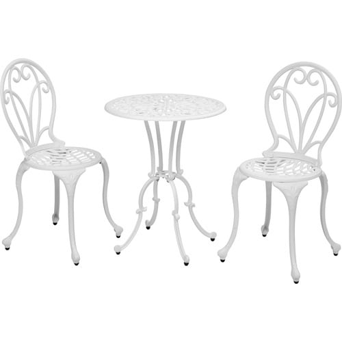 アルミ製なので丈夫で、軽量です。また、サビにも強く丈夫にできています。つる性植物をイメージしたエレガントな造形美のテーブル3点セット(テーブル1台/チェアー2脚)。 |