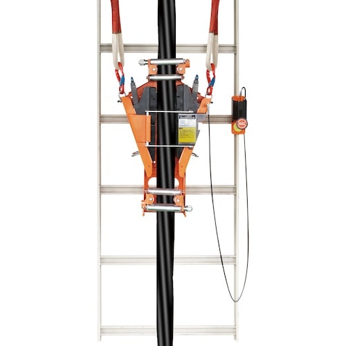 ケーブル延線工事で上から下にケーブルを下ろす際の緊急安全落下防止装置です。置き型と吊下げ型の2ウェイで使用可能です。 |