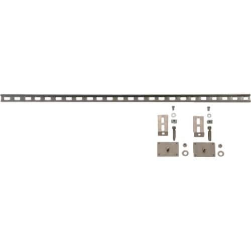 L字の留め具で、床または壁に固定します。必要に応じレール(1194mm)を活用します。キャビネット側は粘着テープになっており、キャビネット自体には穴を開けません。 |