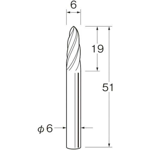 刃径(mm):6 | 刃長(mm):19 | 軸径(mm):6 | 全長(mm):51 | 最高使用回転数(rpm):28000 | オール超硬・ロー…