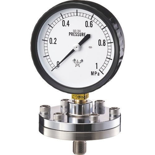 測定しようとする流体と圧力計との間にダイヤフラム(隔膜)を設け、この間を非圧縮系特殊液で充満させて圧力の媒体としています。特に強い酸、アルカリ及び粘性が大きいので、凝固性の流体の測定に。 |