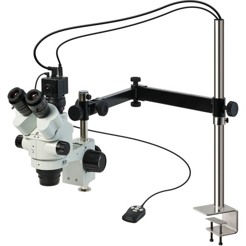 カメラが接続できるズーム式 & モニター用カメラ自由度の高いロングアーム撮影と観察作業が同時に行える三眼実体顕微鏡と、HDMIでモニターに映像を出力できるフルHDのカメラのセットです。 |