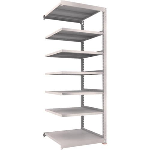 ボルトを1本も使用していないボルトレス構造で、分解・組み立て作業が簡単で、作業時間を大幅に短縮できます。棚の段変更が、25mmピッチで、自由に調整、変更ができます。 |