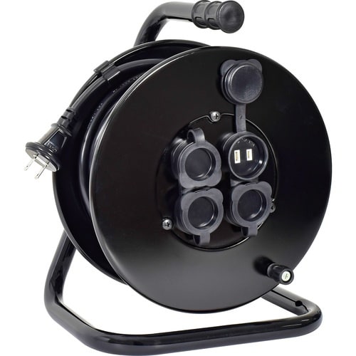 防雨防塵型でアースなしのコードリールです。本体色は黒です。各種屋外工事に。 |
