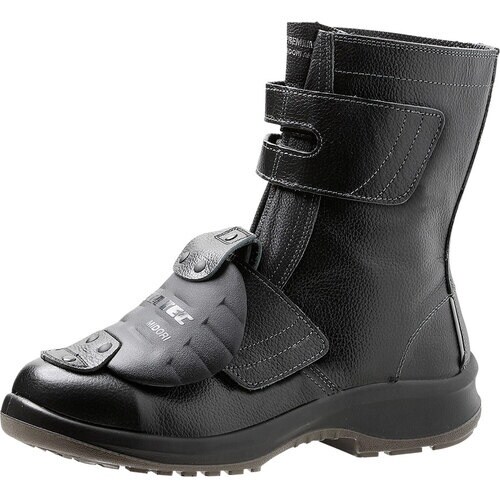 落下物から足の甲を保護する軽量な樹脂製甲プロテクタ付きです。落下物の衝撃は先芯へ導かれ、甲プロテクタの変形によって吸収されます。内側にパッチ革(当て革)が付いています。 |