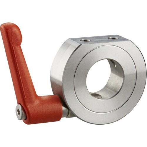 特殊形状のクサビにより少ない力で締め付けが可能なクサビカラーです。クランプレバー付のため、工具なしで簡単に締め付けができます。Dカット面のネジ穴を利用してブラケットなどを取り付けることができます。 |