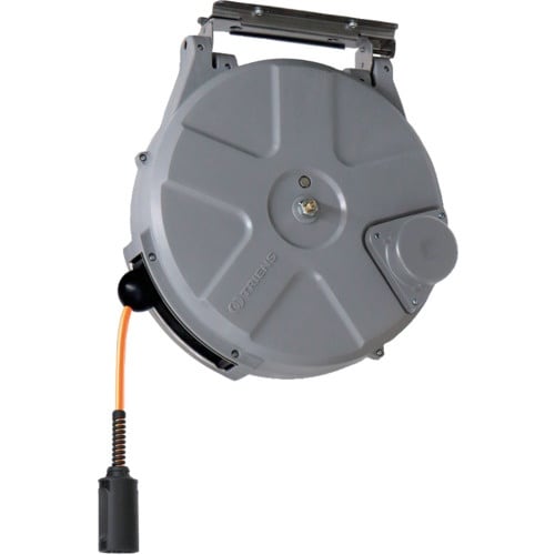 ゆっくり巻き戻るブレーキ機構付きで、安全性を最優先しています。簡単ホース交換機構(継手仕様)です。入力ホースの取回しが自由なエルボを採用しています。空圧工具使用時のエアー供給用。 |