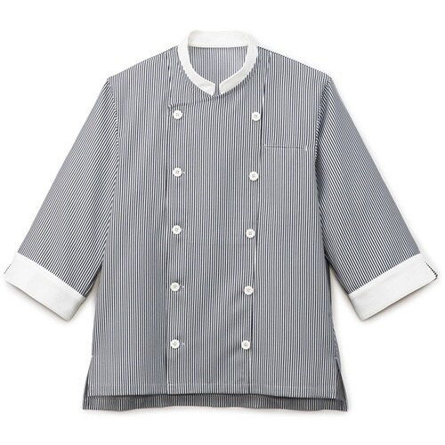 衛生対策機能付き、爽やかなストライプ柄のショップコートです。塩素系漂白剤による退色を防ぐ素材機能から、元の色合いが持続します。水仕事など、腕まくりの手間なく作業ができる七分袖。 |