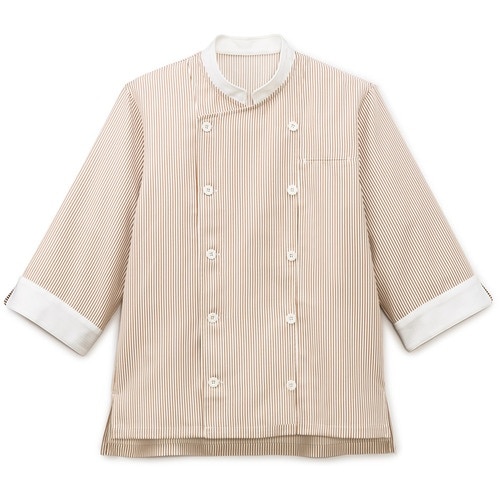 衛生対策機能付き、爽やかなストライプ柄のショップコートです。塩素系漂白剤による退色を防ぐ素材機能から、元の色合いが持続します。水仕事など、腕まくりの手間なく作業ができる七分袖。 |