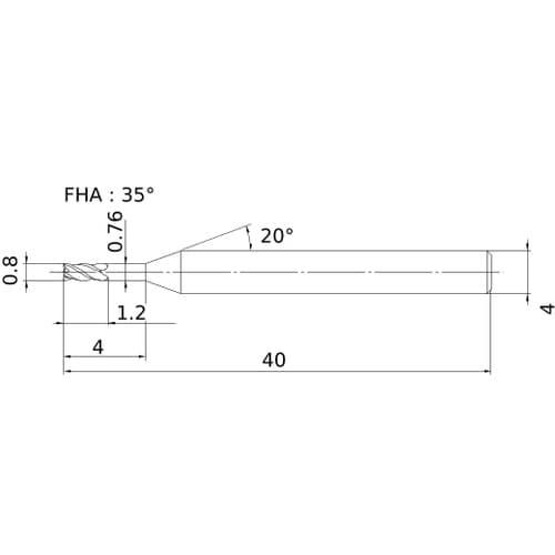 刃数ZEFP(枚):4 | 切削径DC(mm):0.8 | 最大切込みAPMX(mm):1.2 | 使用可能長さLU(mm):4 | 機能長さLF(m…