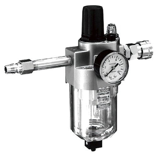 エア工具の作動と防錆性を高めます。フィルタ、レギュレータ、ルブリケータ付の圧力調整器。 |