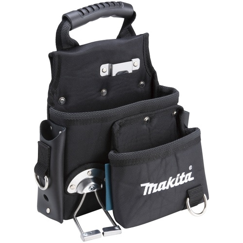 大小2か所のレザー地の釘袋、メジャーフック掛け、ハンマーホルダー、工具ホルダー付。 |