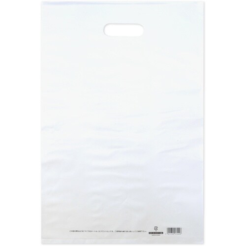 ポリエチレン製の手抜きタイプの手提げ袋です。パリッとしたハードタイプ。本体裏面にバーコード等情報が記載されています。