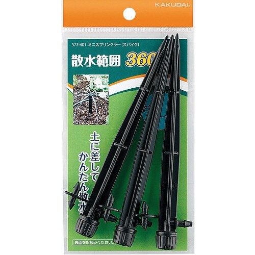 全長153ミリ上部をまわして水量調節ができます。パッケージサイズ W95ミリ×H180ミリ×D16ミリ品番のうしろの( )内は散水角度地面に突刺し、5780マカロニホースで給水し散水します。 |