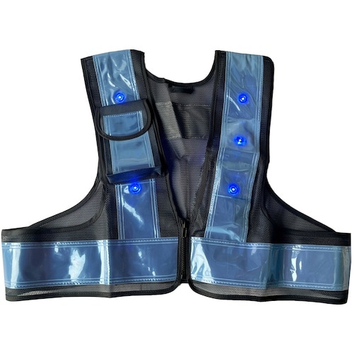 前合せ部分がファスナーなので着脱がスムーズです。 LED11個で夜間の視認性抜群です。 |