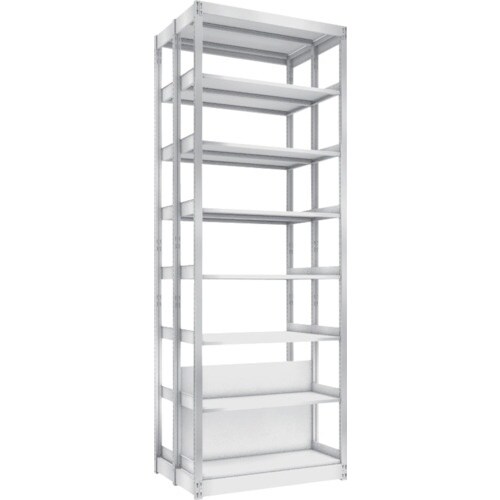 ボルトを1本も使用していないボルトレス構造で、分解・組み立て作業を短縮できます。棚の段数変更が小刻みな25mmピッチで、自由に調整、変更ができます。高さ、奥行が同じであれば、増結することができます。 |